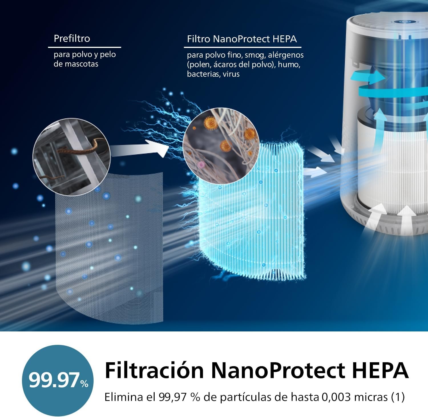 Lo que hace que estos purificadores sean tan efectivos es su sistema de filtrado multicapa. En 2026, el estándar HEPA H13 (grado médico) es la referencia: es capaz de atrapar el 99,97% de las partículas de hasta 0,3 micras. Esto incluye polen, caspa de mascotas, ácaros del polvo, esporas de moho e incluso algunas bacterias y virus. El sistema se complementa con un pre-filtro para pelusas y pelos grandes, y un filtro de carbón activado que neutraliza olores de cocina, humo de cigarrillo o compuestos orgánicos volátiles (COV) presentes en pinturas y muebles.